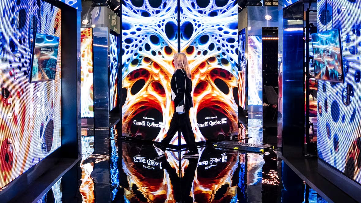 People walk through a display booth for the Mila, Quebec Artificial Intelligence Institute, at the All In AI conference in Montreal on Thursday, Sept., 25, 2025. (Christopher Katsarov/The Canadian Press)