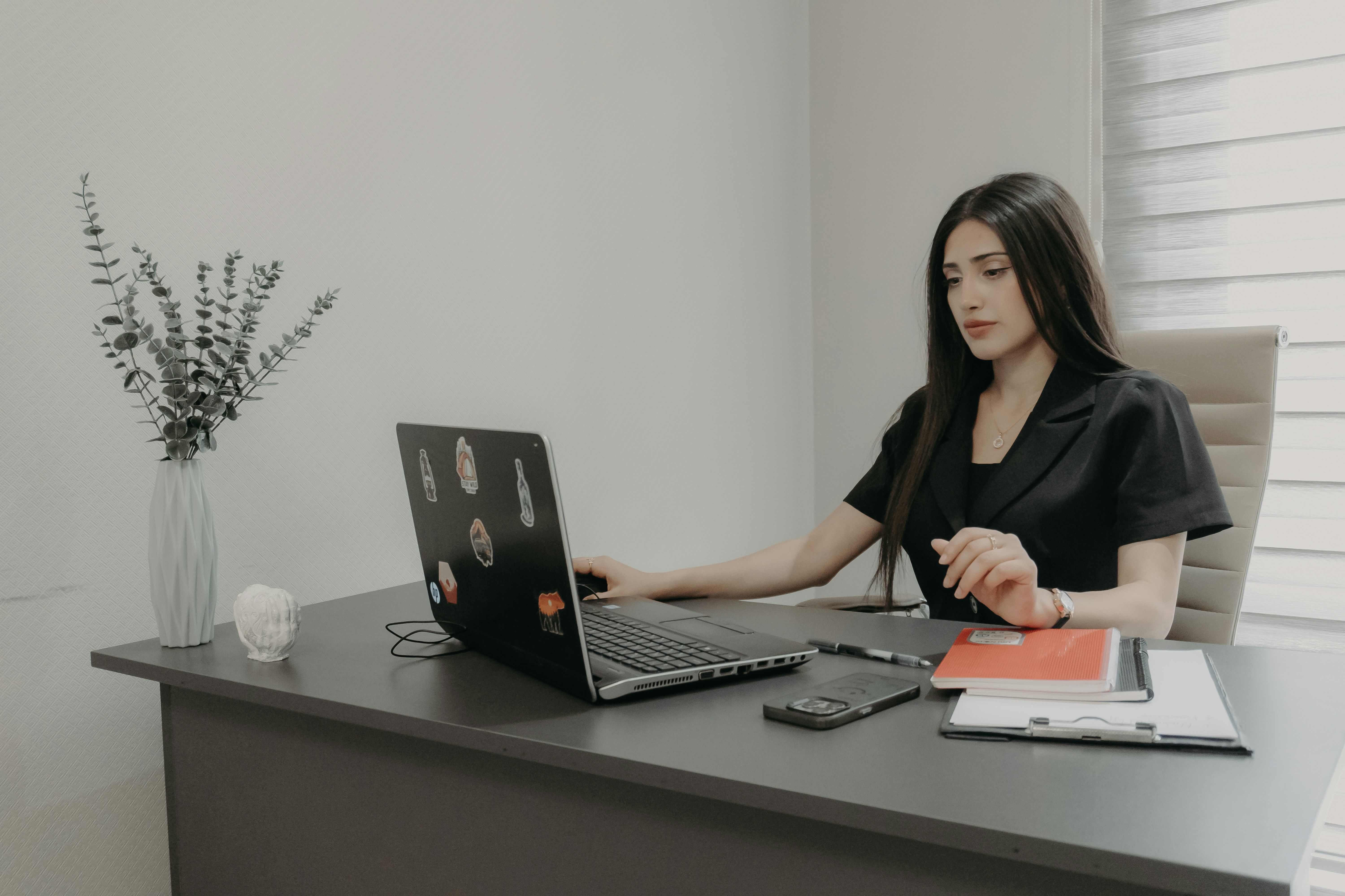 Business professional using AI chatbot for workflow productivity with laptop and notebook in 2026