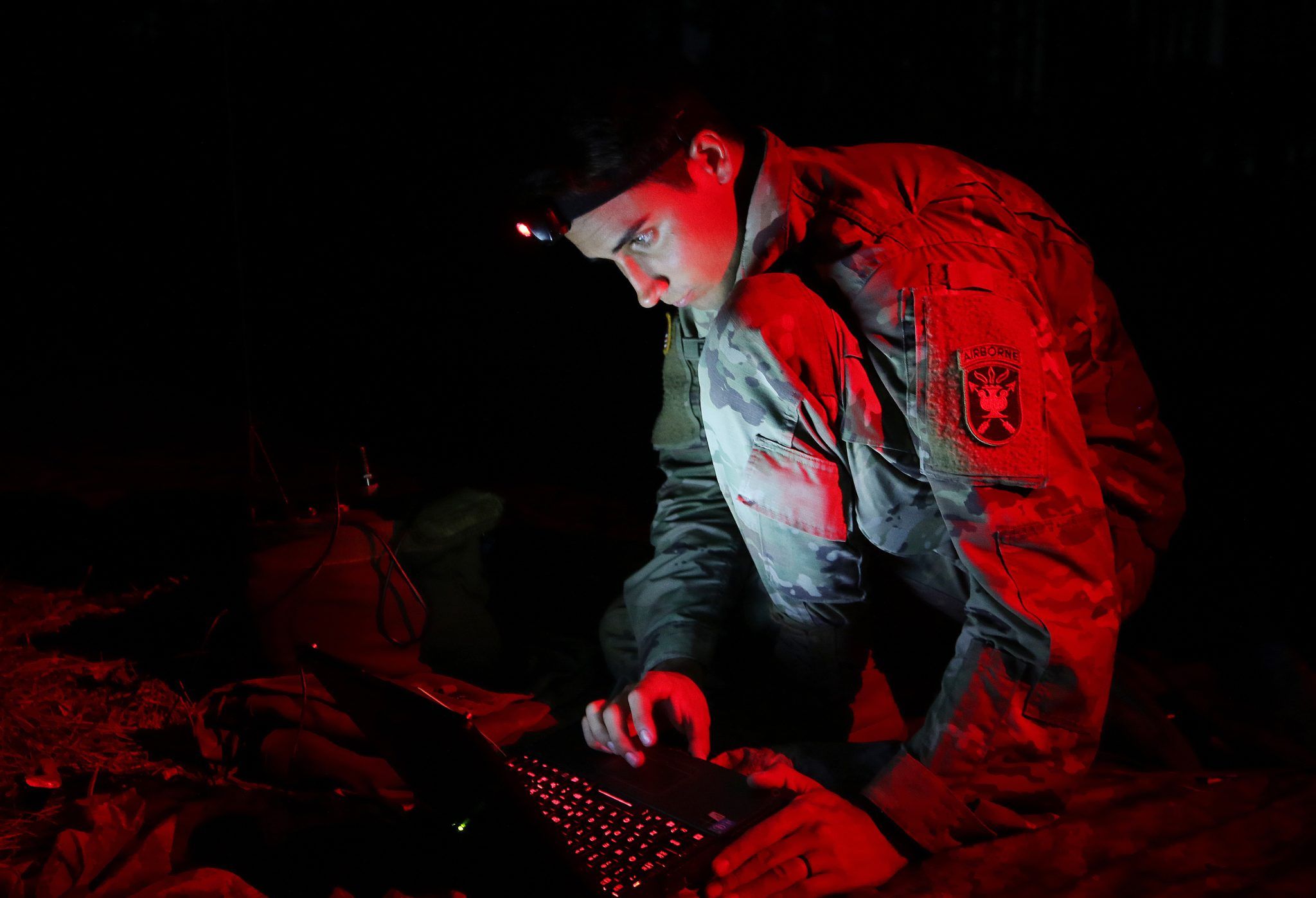 Soldier uses a rugged laptop during a nighttime antenna training. Photo: K. Kassens/US Army